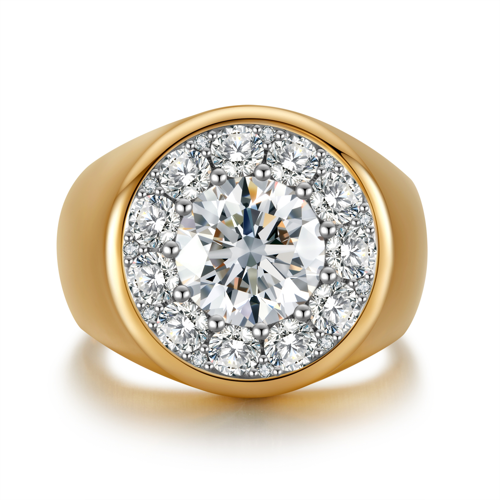 This 18K yellow gold diamond ring features a unisex design suitable for both men and women. Centered with a 2.01-carat round brilliant cut diamond of D-E color and VS clarity, it radiates captivating brilliance enhanced by 1.081 carats of shimmering accent diamonds in an elegant halo setting. The substantial 18K yellow gold band offers both luxurious appeal and durable quality, making this versatile piece ideal for engagements, special occasions, or daily wear to express personal style with timeless sophistication.