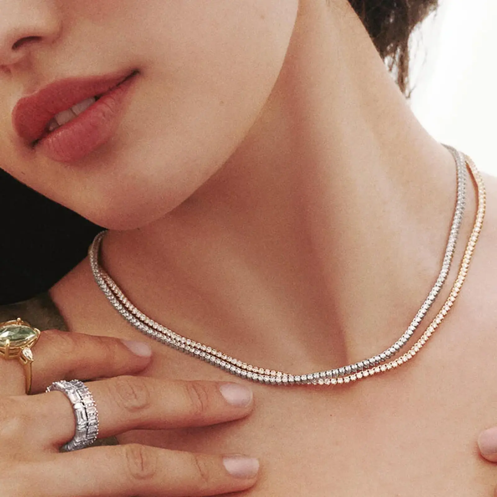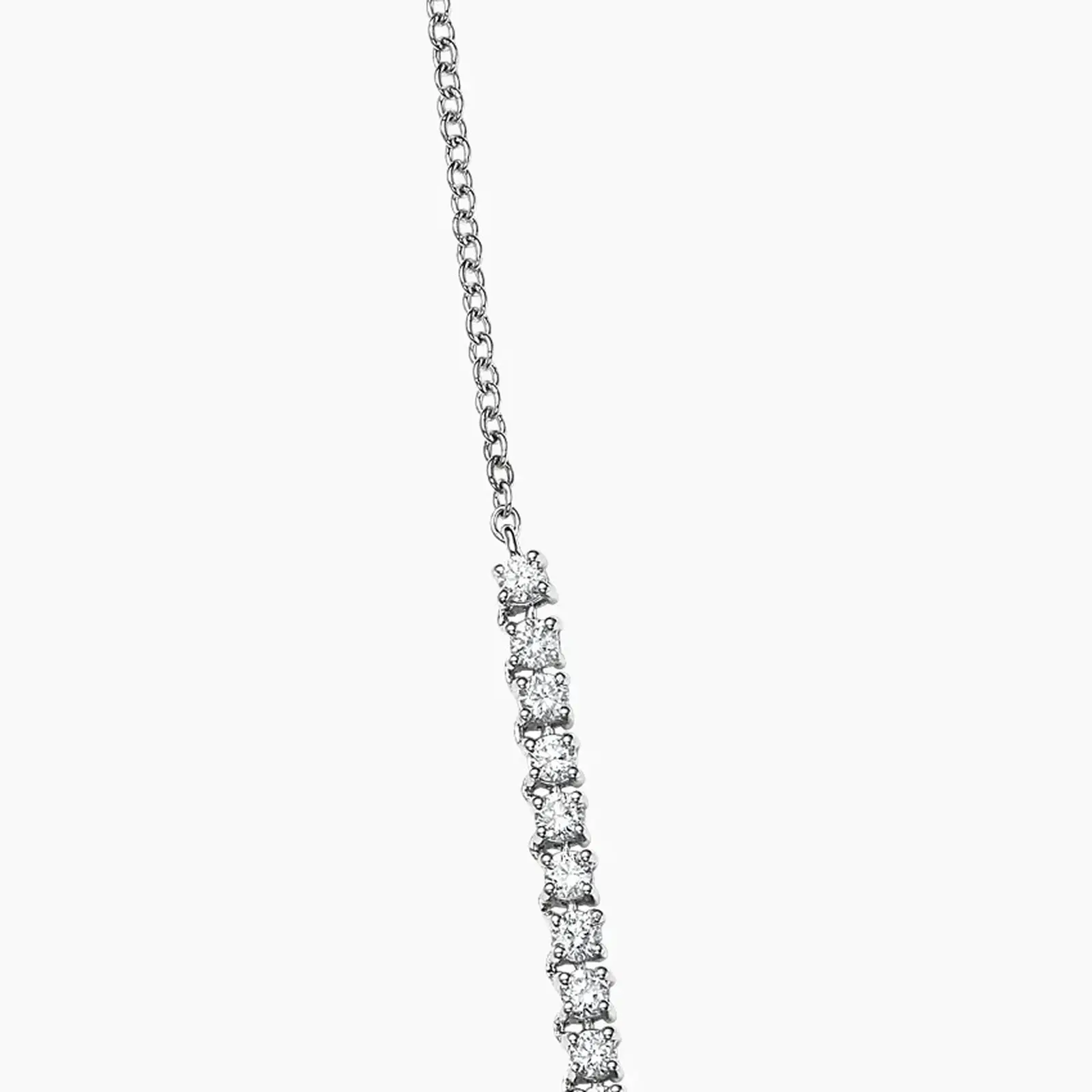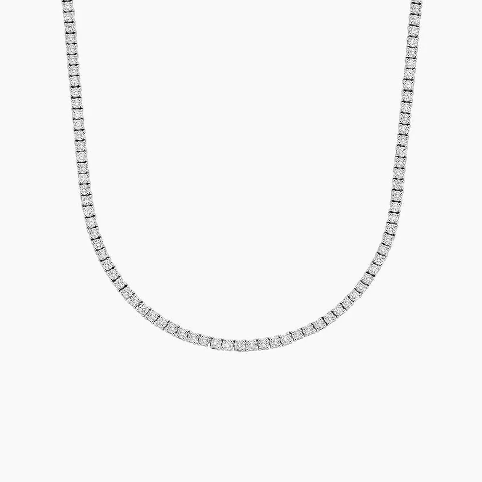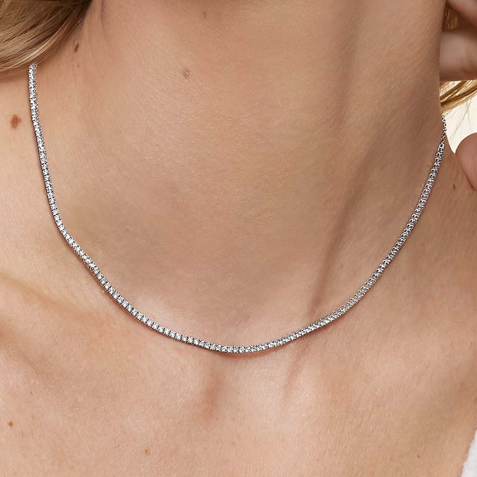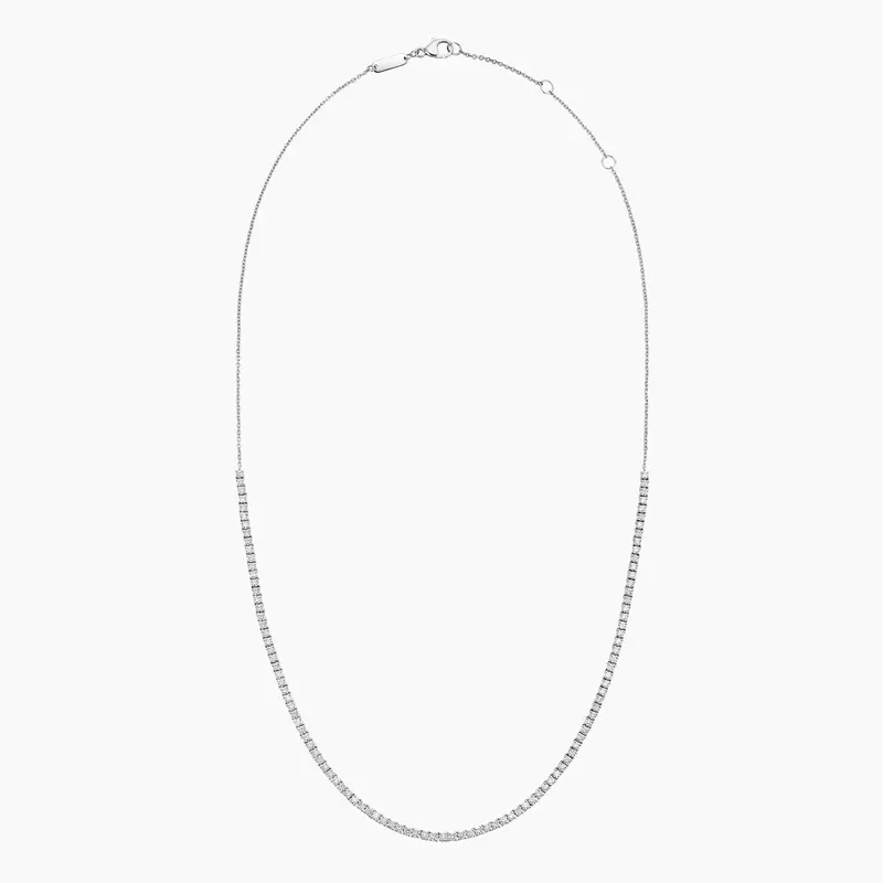 This petite diamond tennis necklace features shining round diamonds that wrap half of the way around while a chain completes the loop, creating a glamorous yet understated look. The length of the necklace can be adjusted to 16, 17, or 18 inches to suit individual preference.