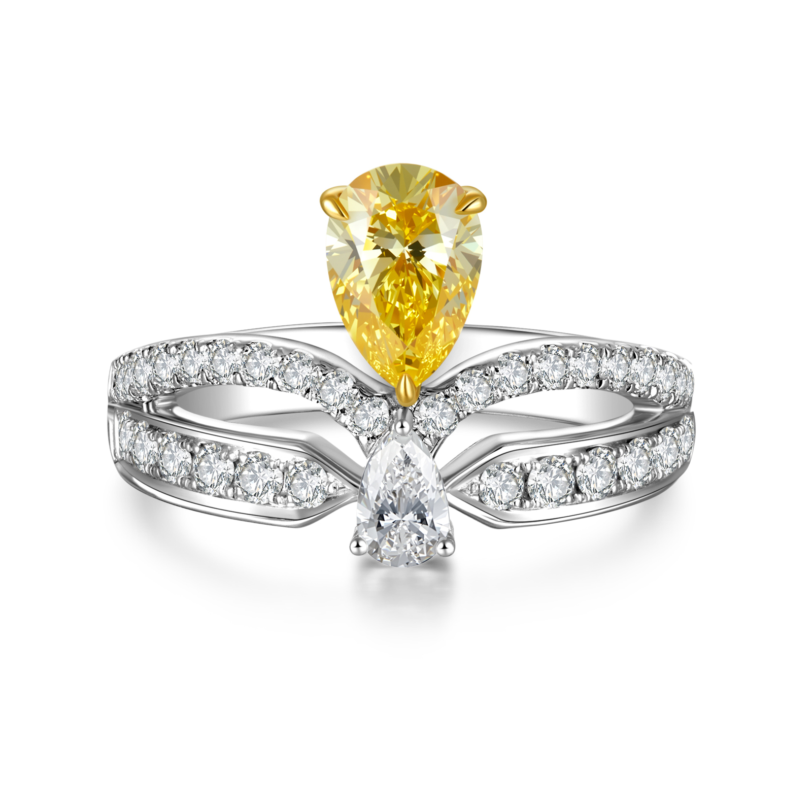 This 18K gold masterpiece is a stunning fusion of vibrant color and architectural elegance. At its heart lies a 0.712CT pear-shaped yellow diamond, radiating a brilliant golden hue, framed by a 0.58CT white diamond halo. The double-layer water-drop silhouette creates a sophisticated sense of depth, further enhanced by a shimmering pavé-set band. A highlight of this piece is the meticulous two-tone setting: yellow gold prongs are used to intensify the sun-kissed glow of the center stone, while polished white gold amplifies the crisp fire of the surrounding diamonds. A truly unique statement piece for those who appreciate high-end design and rare gemstone artistry.