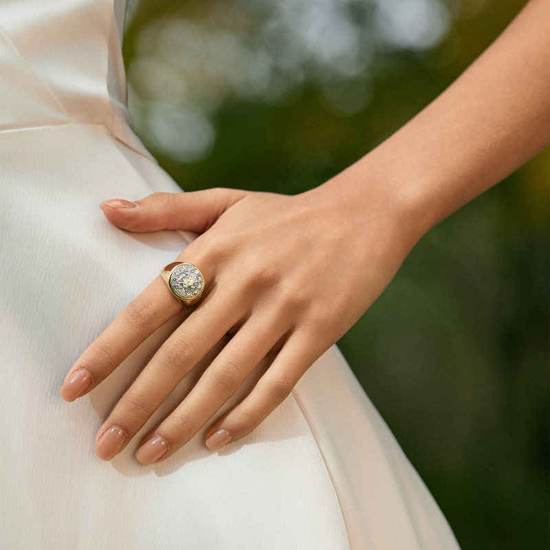 This 18K yellow gold diamond ring features a unisex design suitable for both men and women. Centered with a 2.01-carat round brilliant cut diamond of D-E color and VS clarity, it radiates captivating brilliance enhanced by 1.081 carats of shimmering accent diamonds in an elegant halo setting. The substantial 18K yellow gold band offers both luxurious appeal and durable quality, making this versatile piece ideal for engagements, special occasions, or daily wear to express personal style with timeless sophistication.